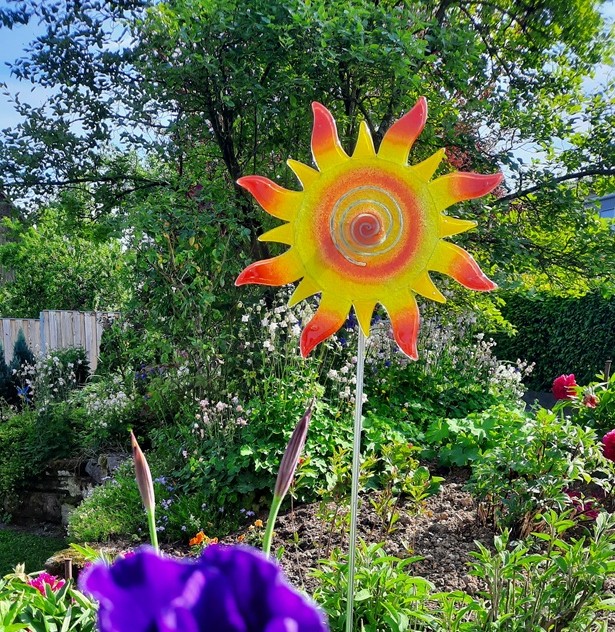 Ich kann Beete neu gestalten oder mit dekorativen Einzelstücken verschönern. Da bin ich völlig frei und das genieße ich. Besonders haben es mir Glasobjekte, bevorzugt Sonnen, angetan. Ich habe sie während eines Urlaubs im Bayerischen Wald entdeckt. Ihre leuchtenden Farben setzen Akzente und verbreiten auch im Winter etwas Fröhlichkeit.